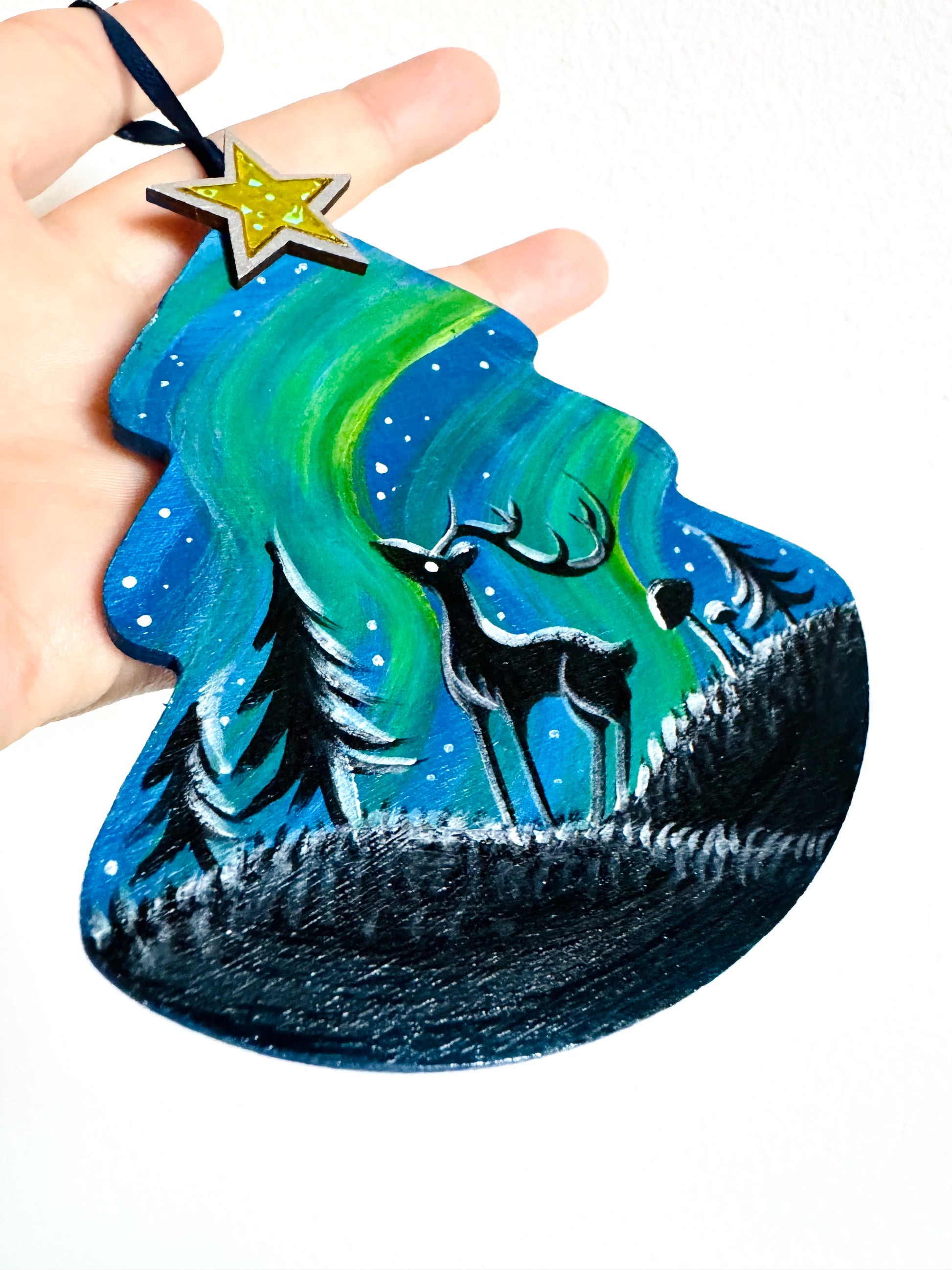 Ein handbemaltes Holzornament, mit Acrylfarbe bemalt, lackiert.