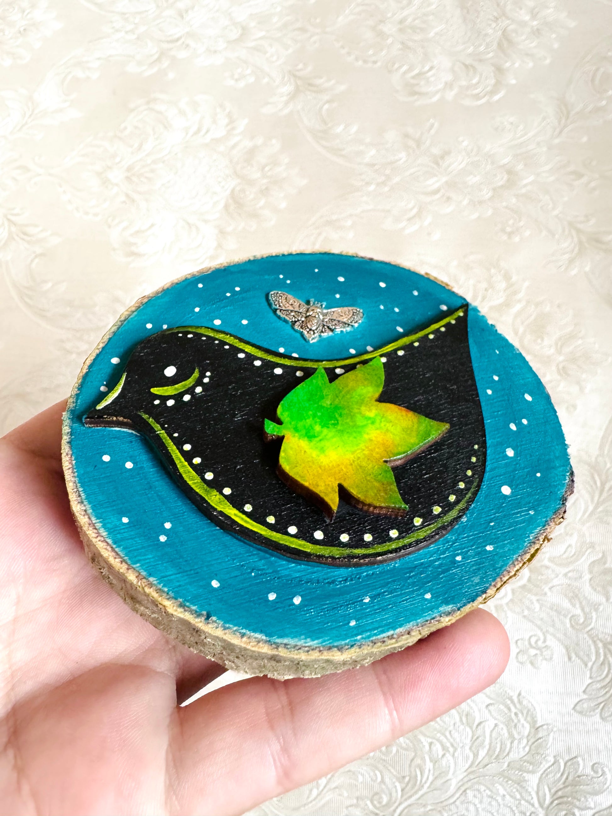 Ein handbemalter Miniatur-Holzscheibenmagnet. Acrylfarbe auf Holz, lackiert, mit Stahl verziert. Größe: ca. 7x8 cm