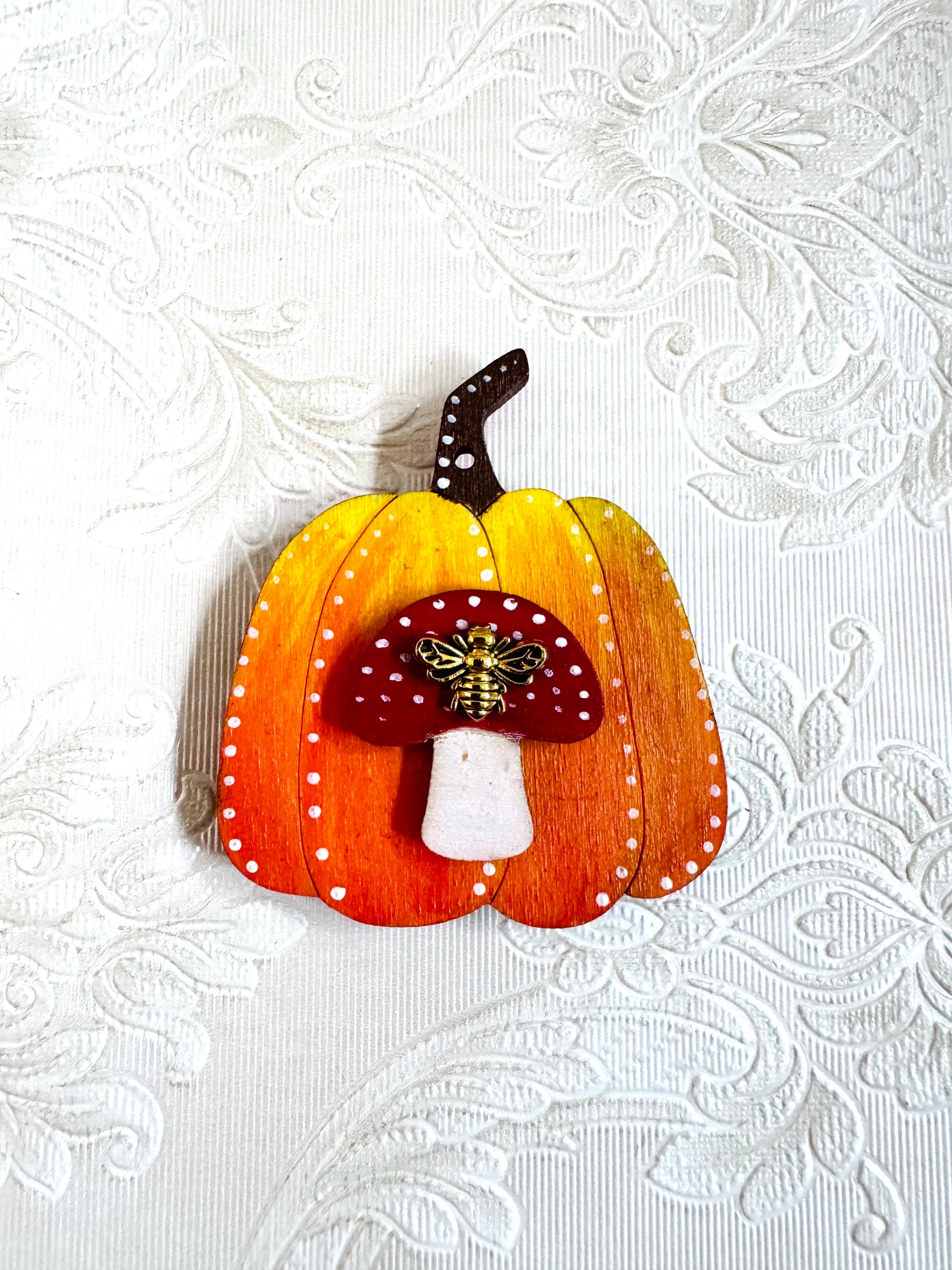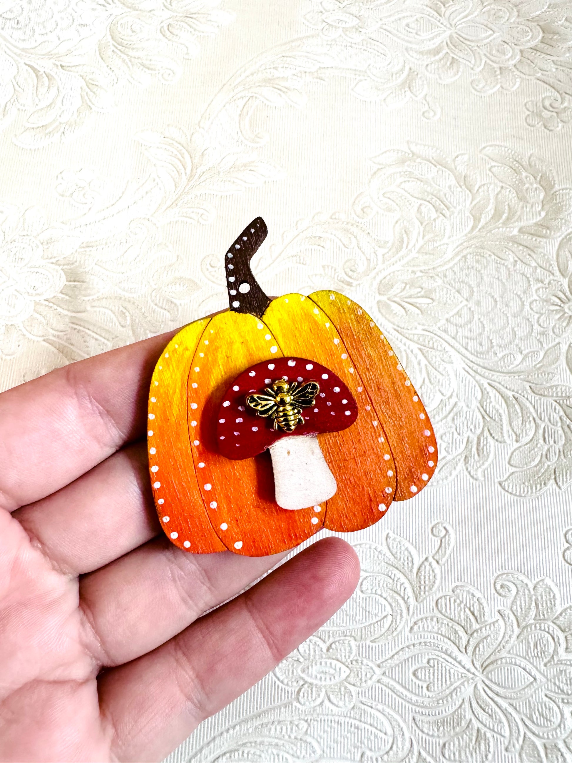 Handbemalter Kürbismagnet mit Pilz und Bienenanhänger aus Stahl / Kézzel festett tök mágnes gombával, fém méhecskével
