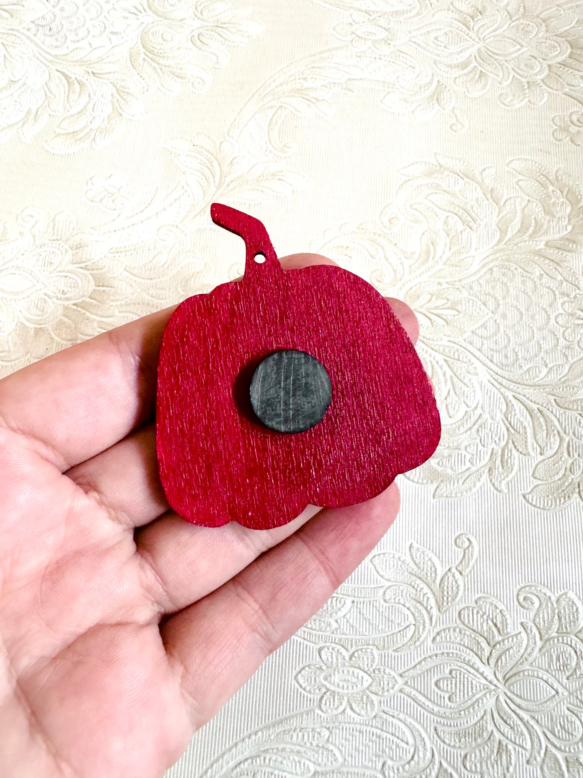 Ein handbemalter kleiner Kürbismagnet, verziert mit Stahlmotte. Größe ca. 5 x 5 cm.