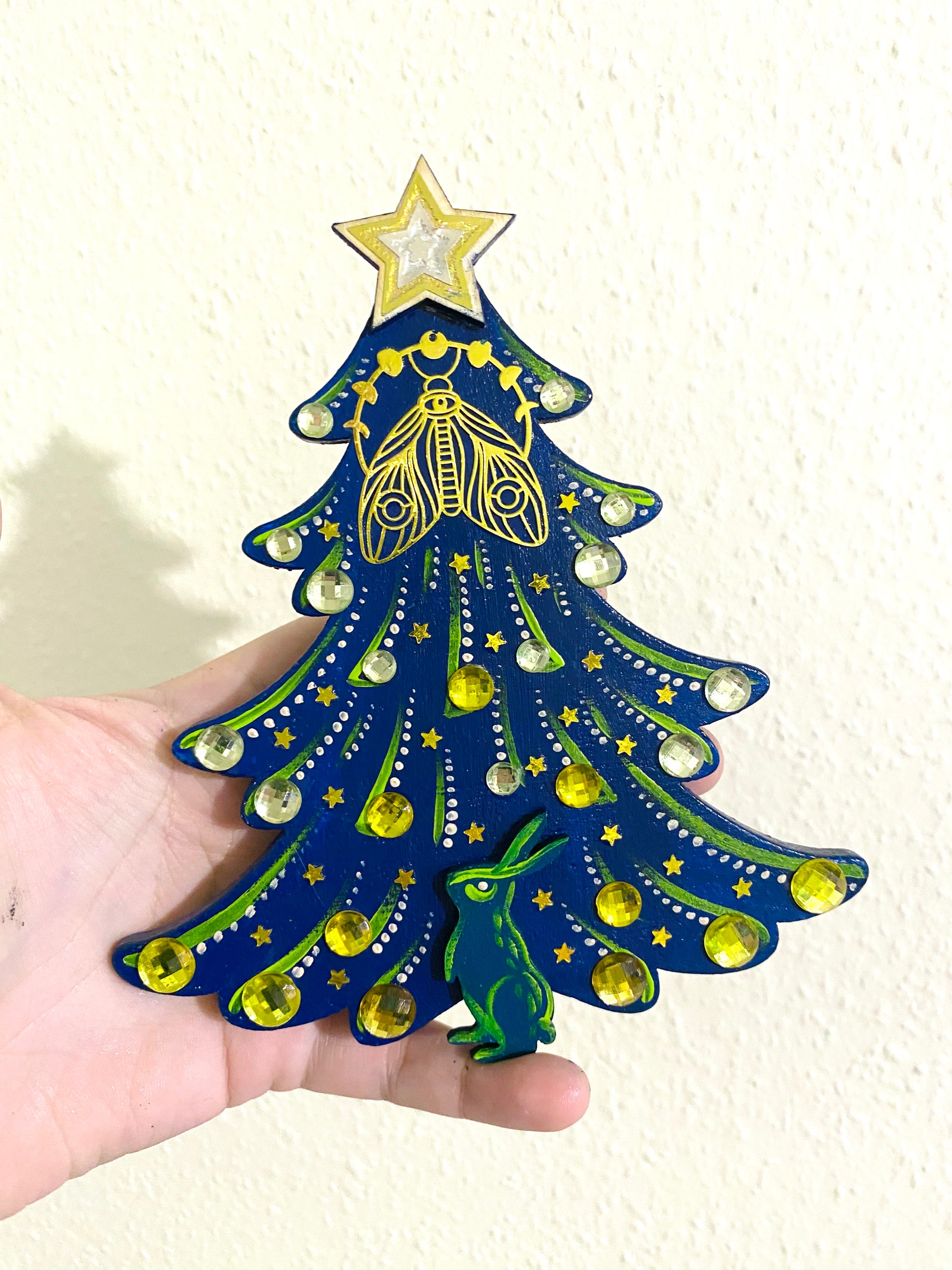 A hand-painted Christmas tree magnet. Hand-painted with acrylic paint, embellished with glitter and steel elements. Material: wood. Varnished for protection.