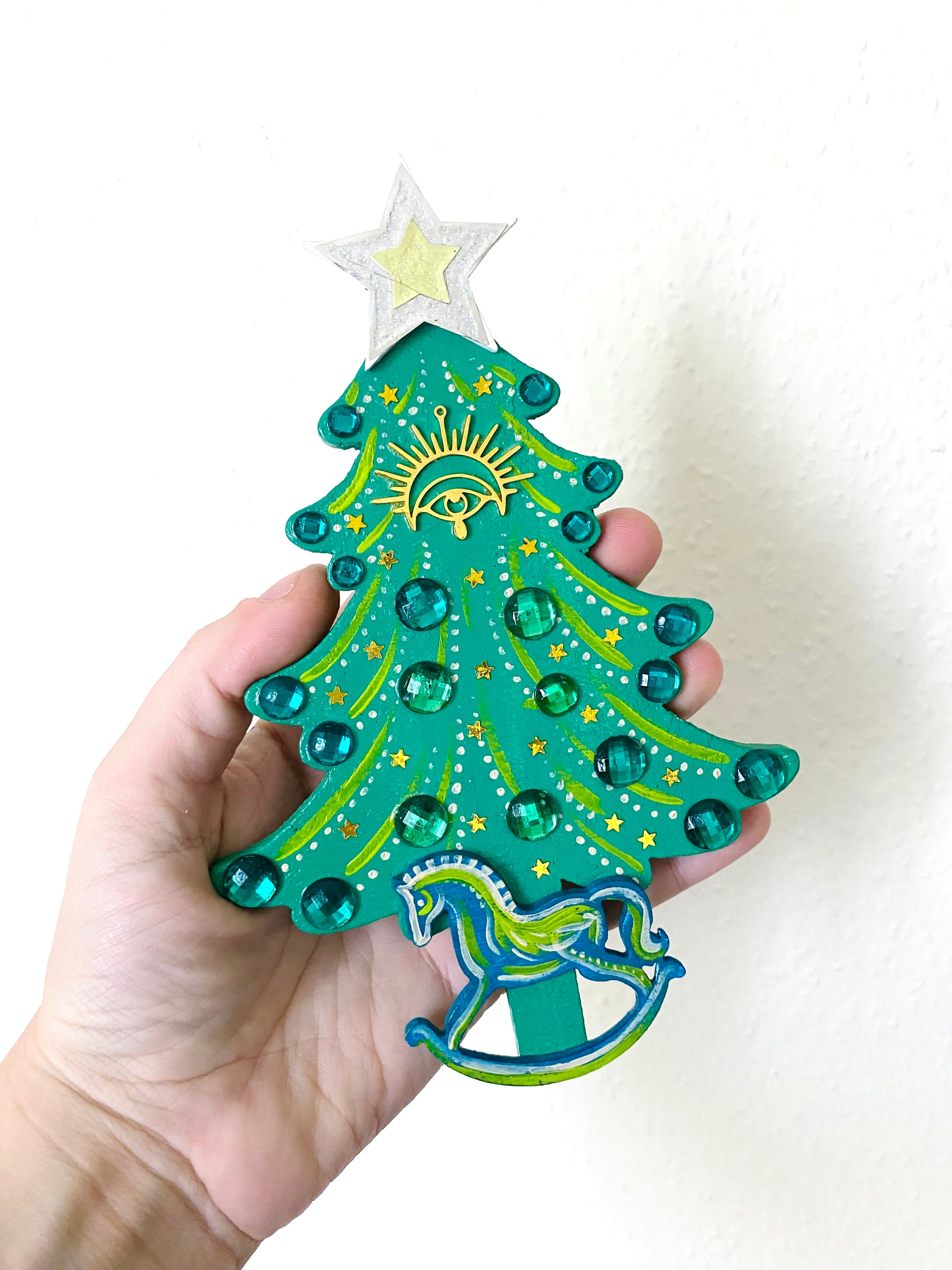 A hand-painted Christmas tree magnet. Hand-painted with acrylic paint, embellished with glitter, rhinestone and steel elements. Material: wood. Varnished for protection.