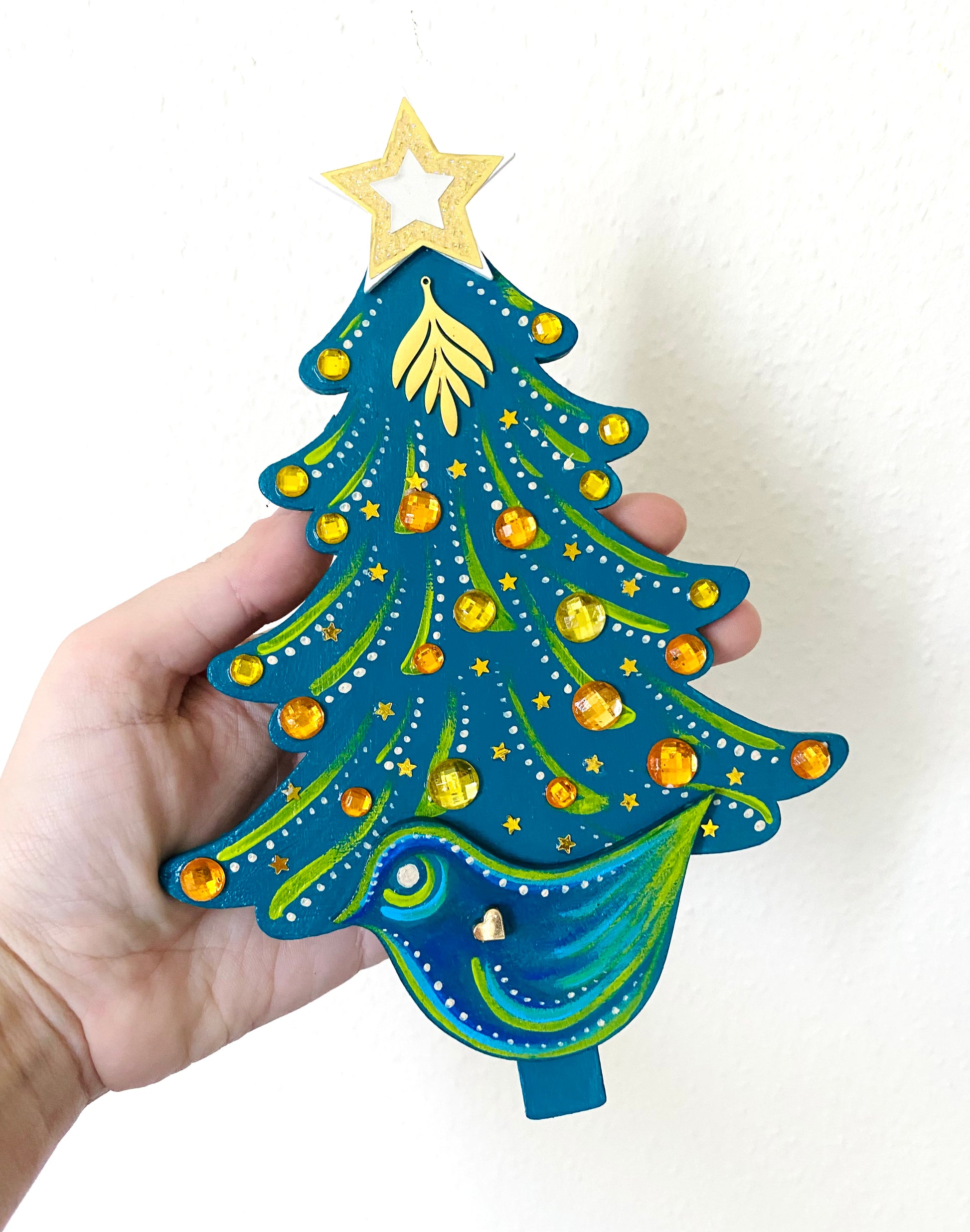 A hand-painted Christmas tree magnet. Hand-painted with acrylic paint, embellished with glitter, rhinestone and steel elements. Material: wood. Varnished for protection.