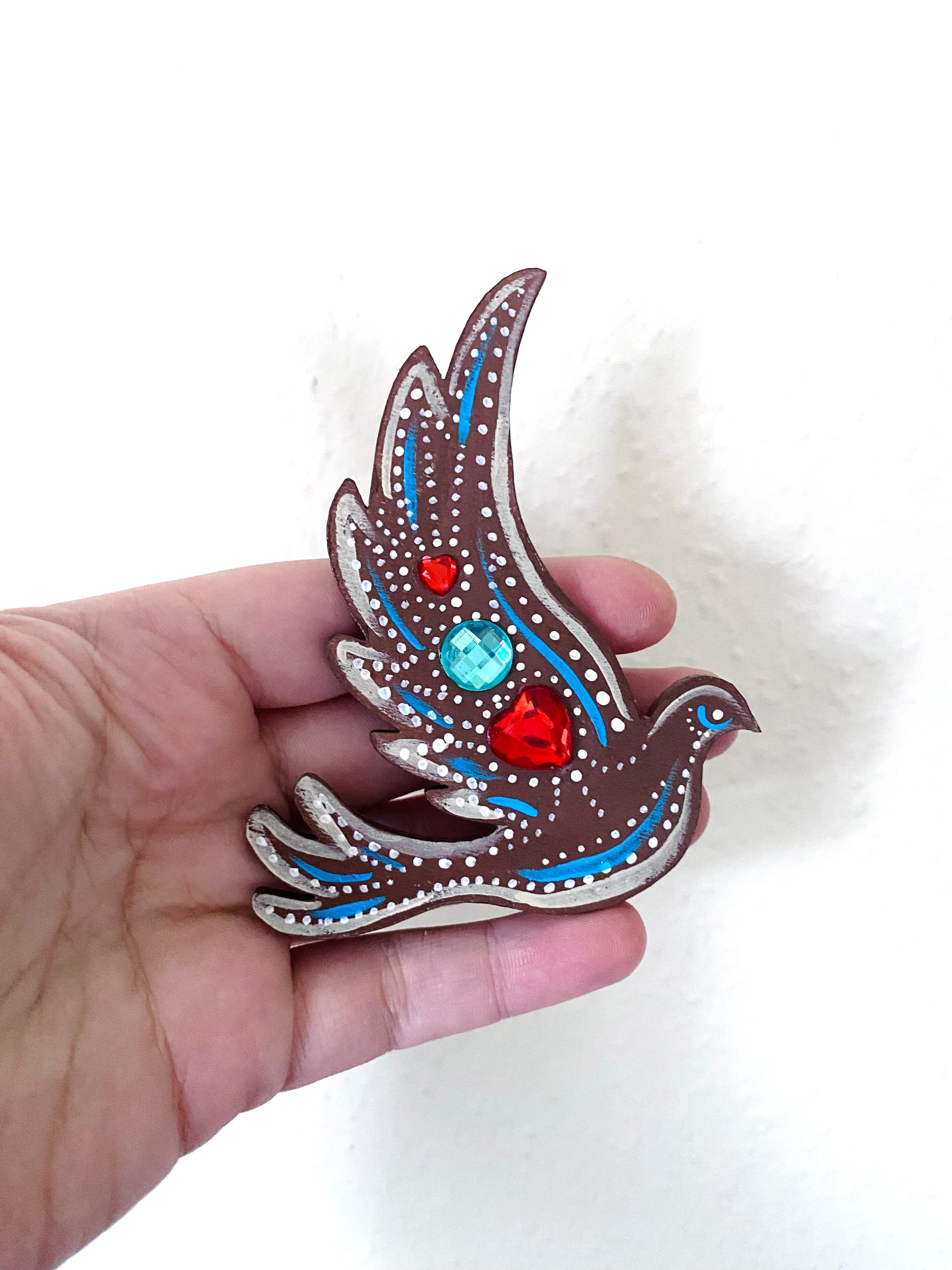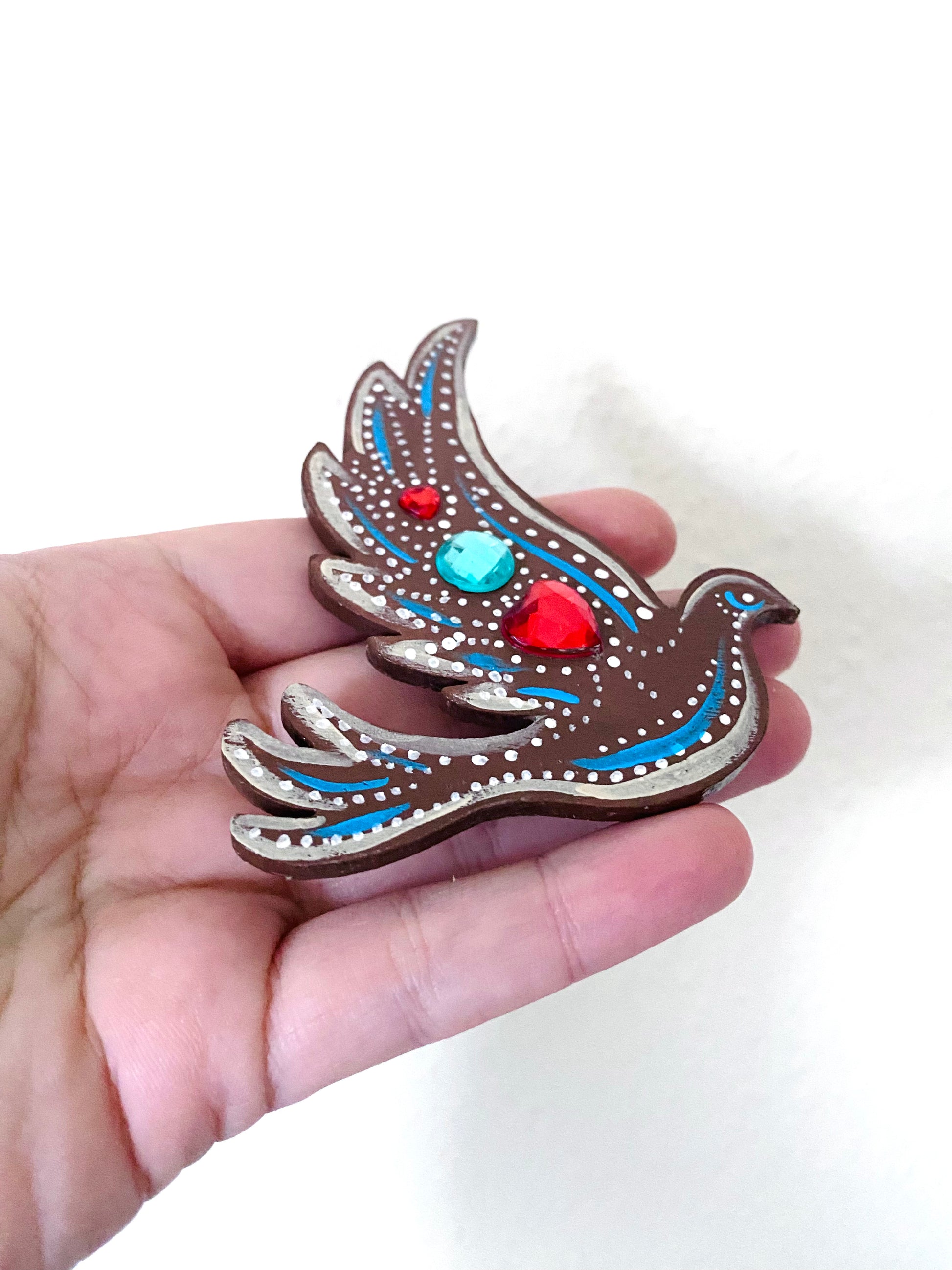 A hand-painted dove magnet. Length is approx. 9 cm. Painted with acrylic paint on wood and sealed with glossy varnish. Embellished with rhinestones.