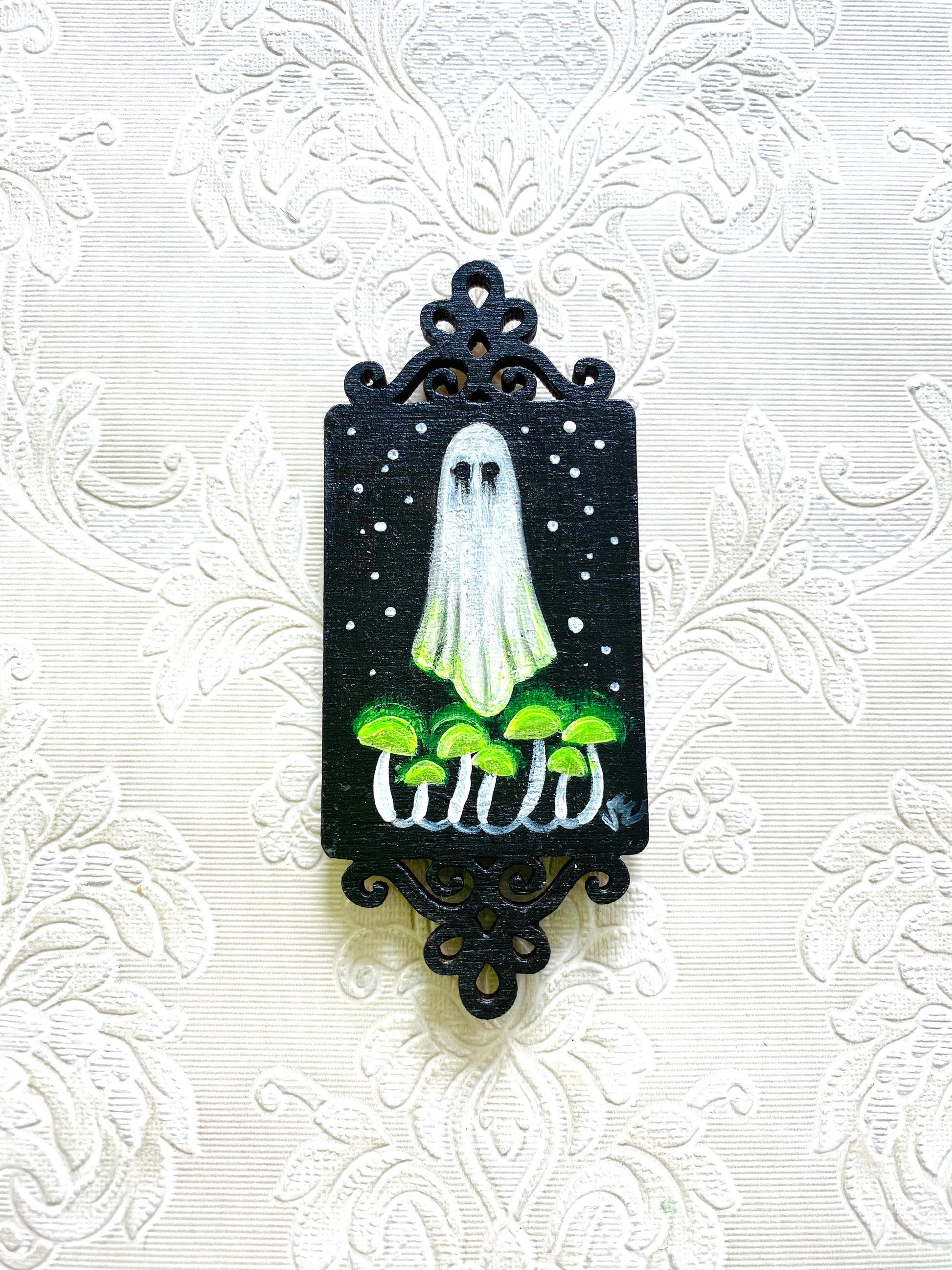 A hand-painted ghostie magnet. Painted with acrylic paint. Perfect for the spooky season!