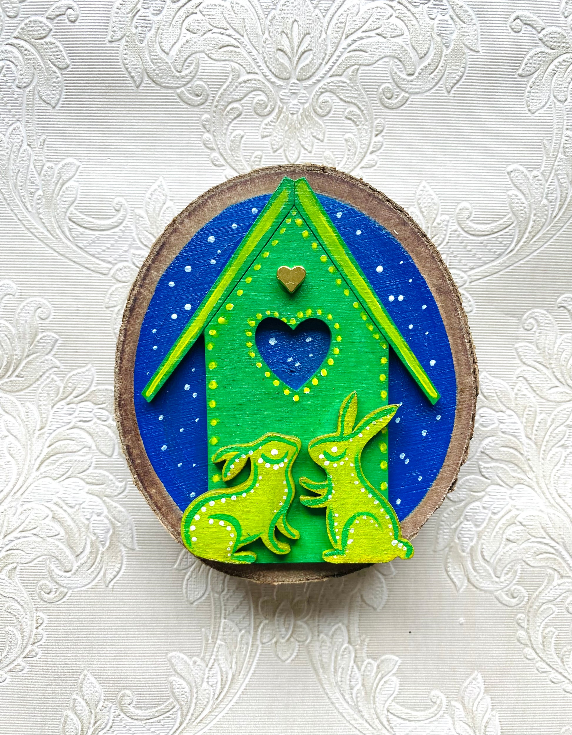 A hand-painted miniature wood slice magnet. Acrylic paint on wood, varnished, embellished with steel. Size: approx. 7x8 cm