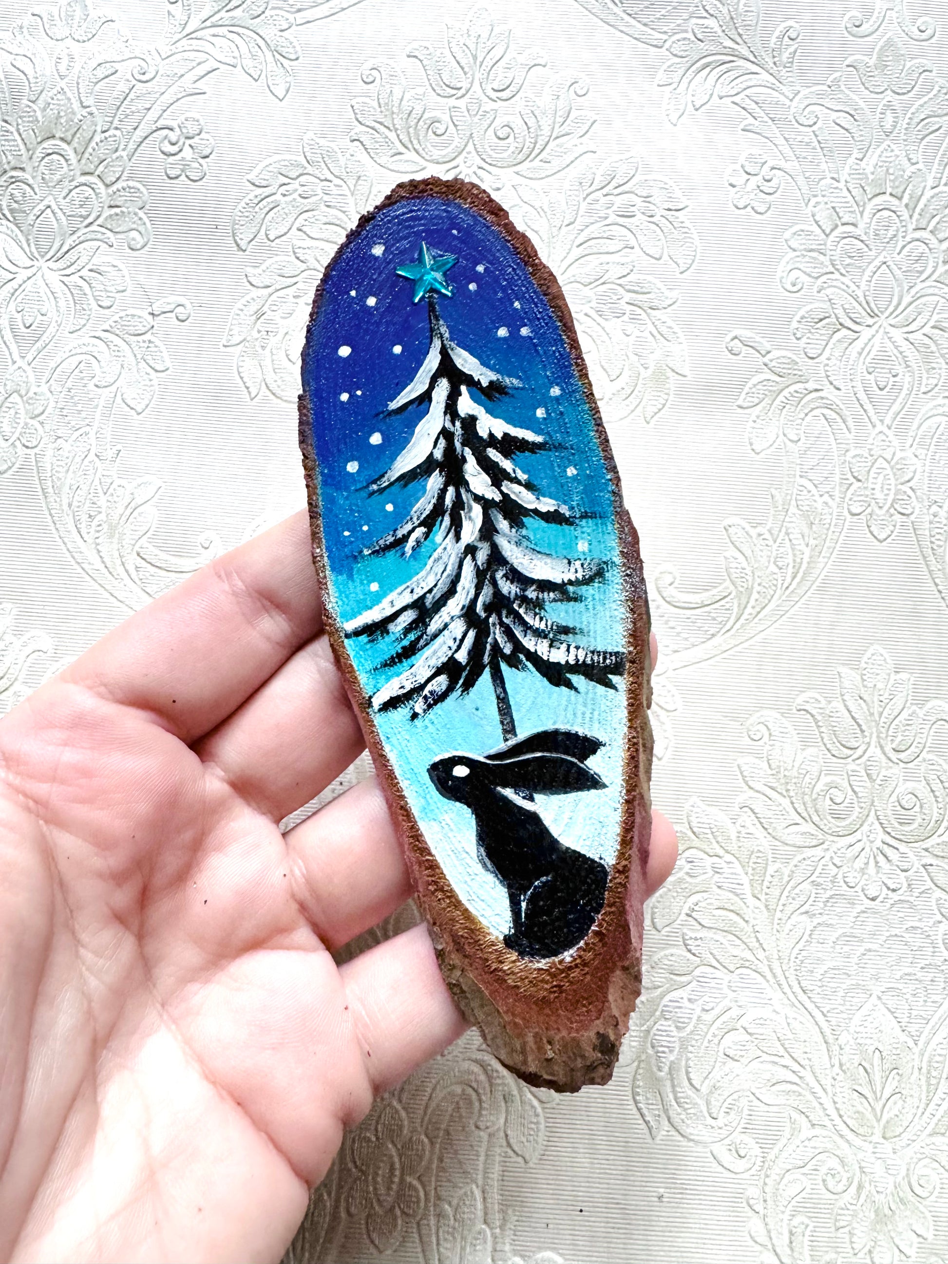 A hand-painted miniature wood slice magnet. Acrylic paint on wood, varnished.