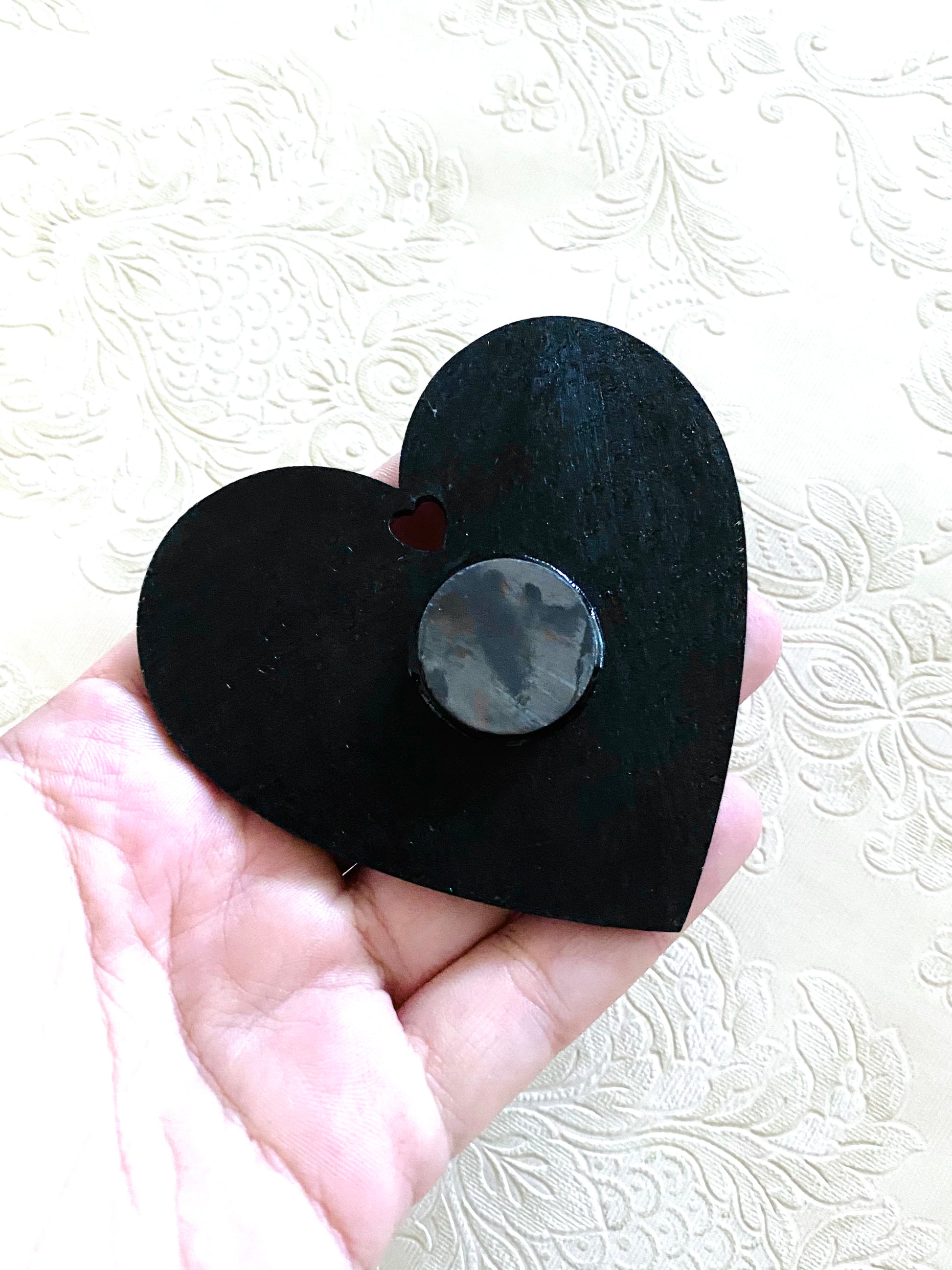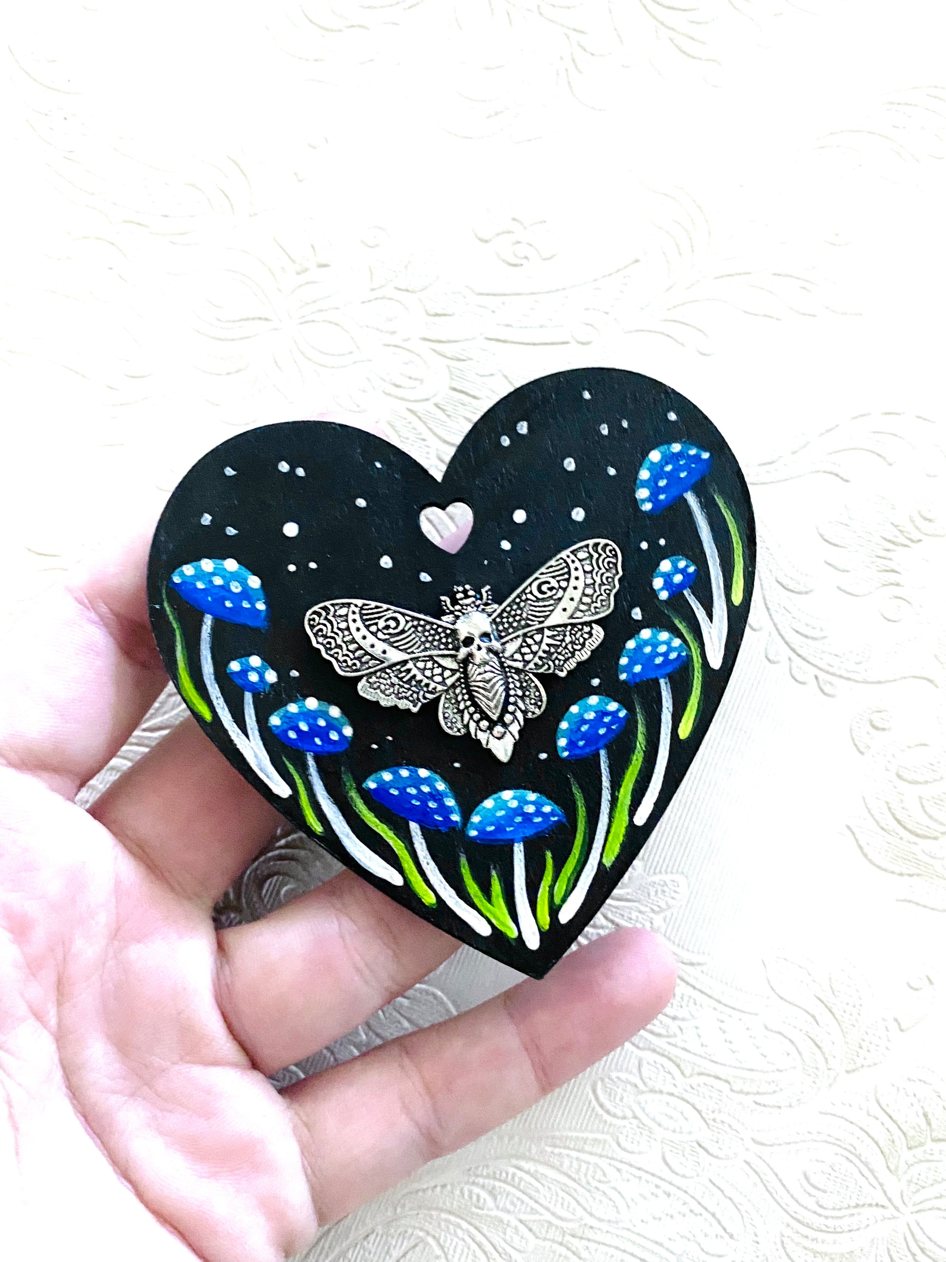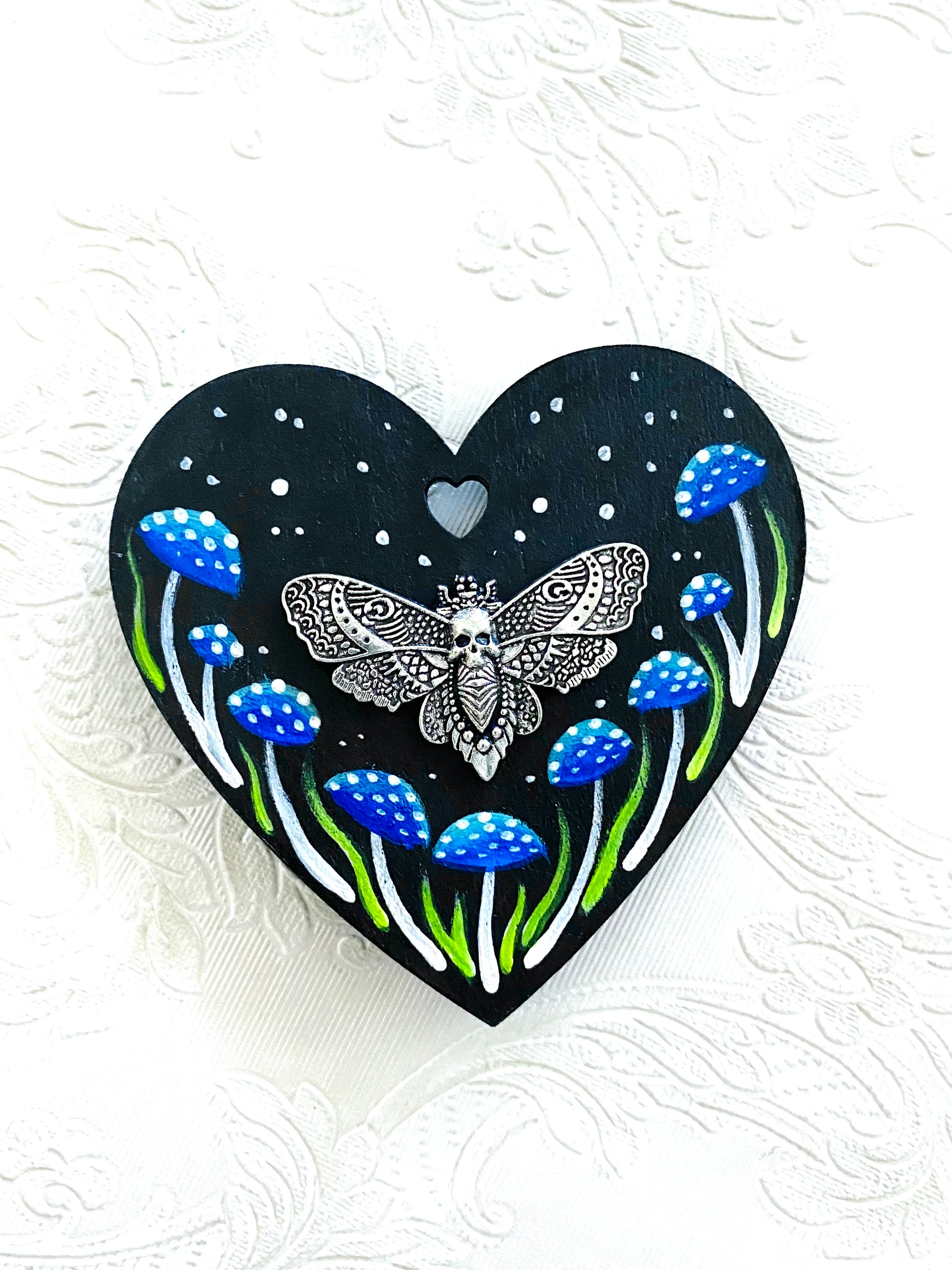 A hand-painted magnet, acrylics on wood, with a steel moth. The heart shape is made of wood. Sealed with glossy varnish.