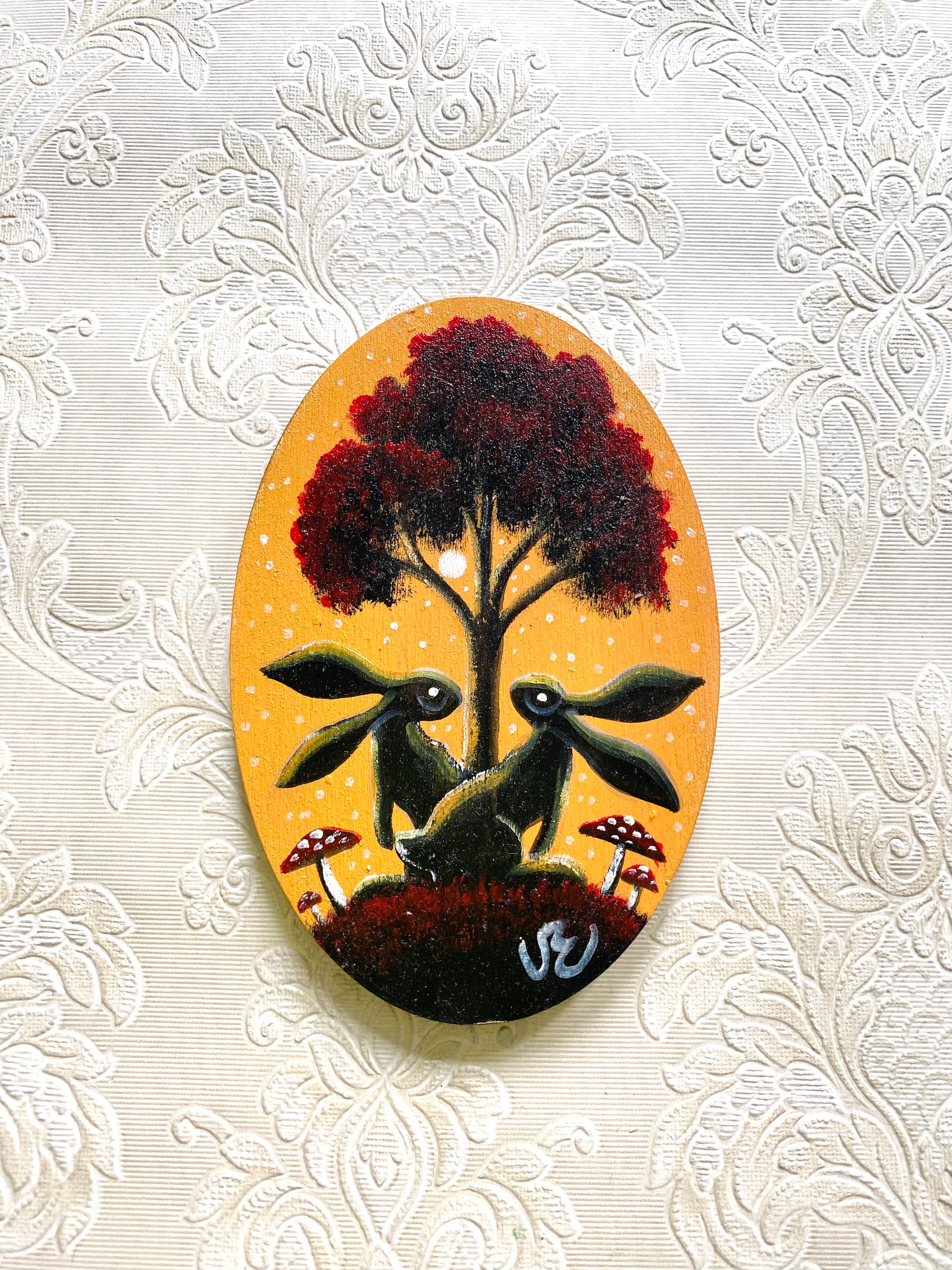 A hand-painted oval rabbit themed magnet. Painted with acrylic paint. Perfect for the spooky season!