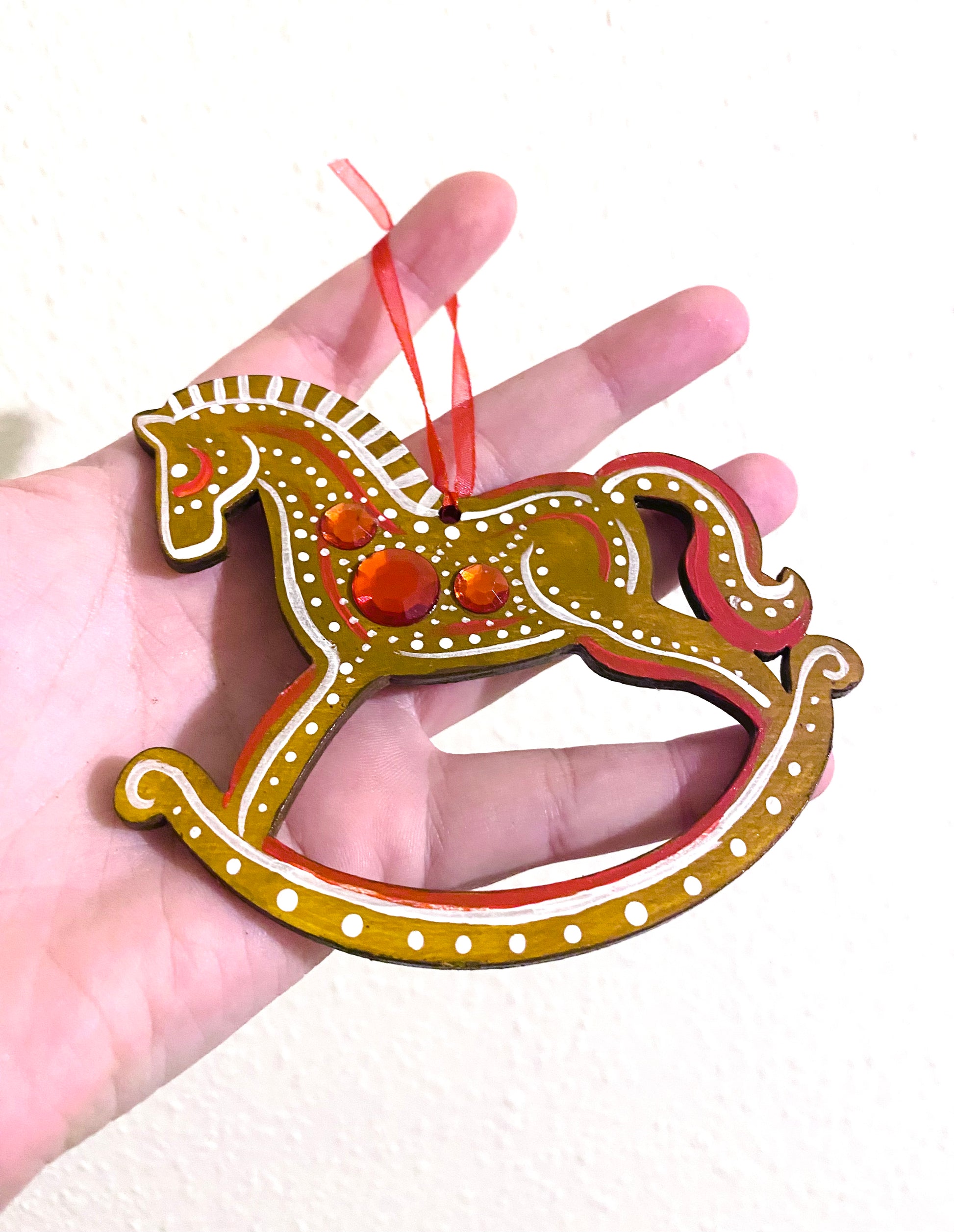 Kézzel festett hintaló dísz, strasszokkal. Mérete 8,5 x 10,4 cm. Mindegyik egyedi darab, tökéletes az ünnepi dekorációhoz! :) Anyaga: lézervágott fa.