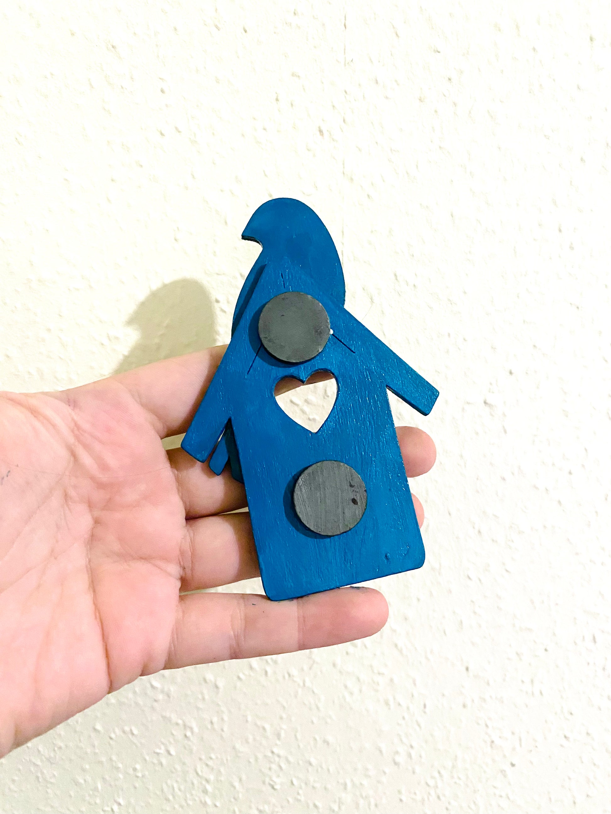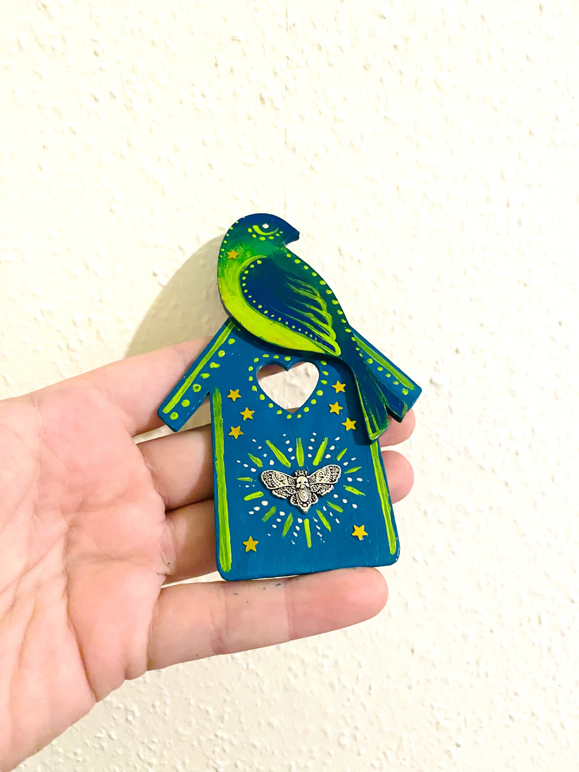 Egy kézzel festett házikó madárral, fém pillével. Akrillal festett fafigura, 2 db mágneskoronggal a hátulján. Mérete kb 7x10,5 cm (legszélesebb pontokon mérve).