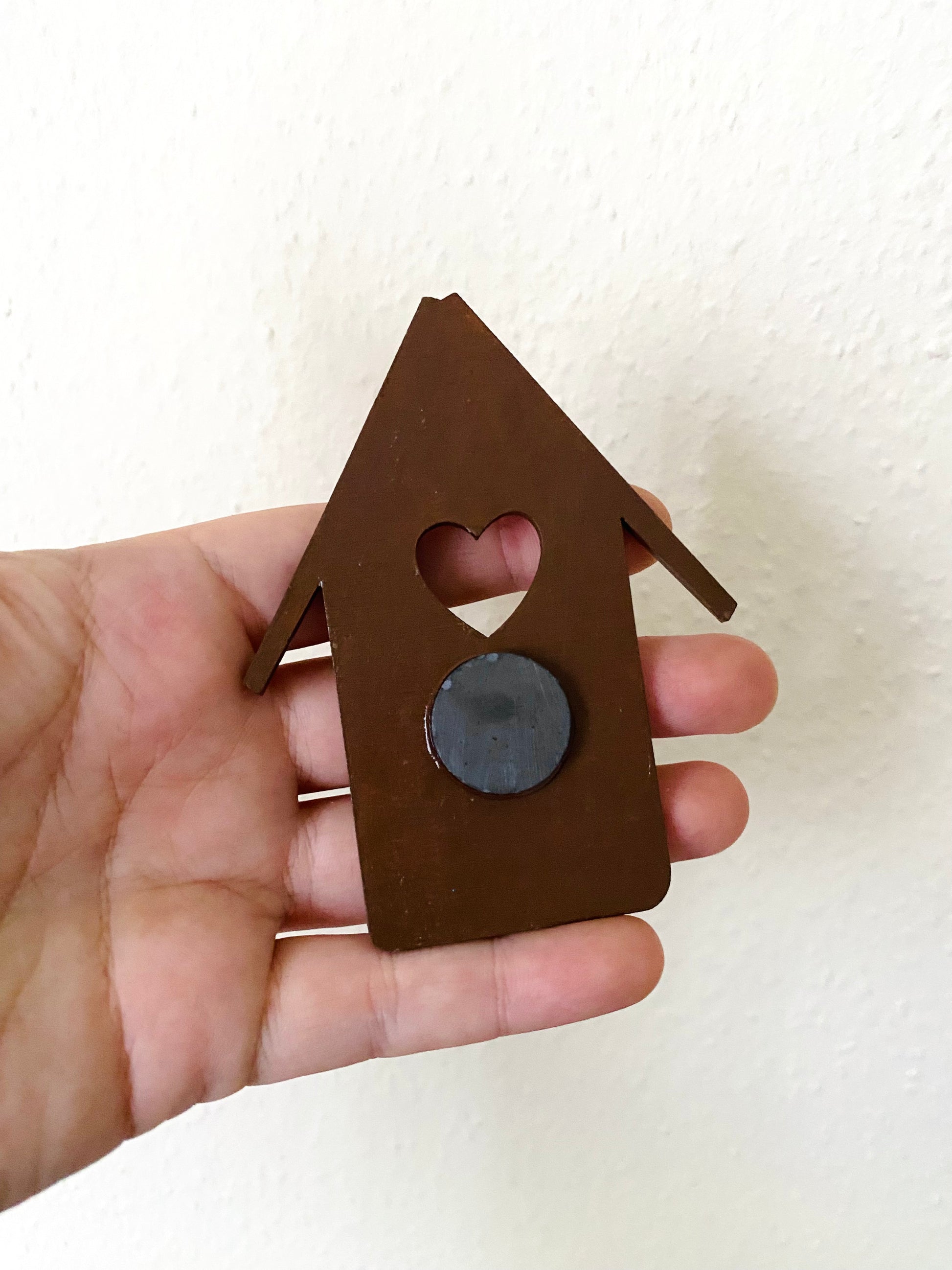 Egy kézzel festett apró házikó, stressz díszítőelemekkel. Akrillal festett fafigura, mágneskoronggal a hátulján. Mérete kb 9x6,5 cm (legszélesebb pontokon mérve).