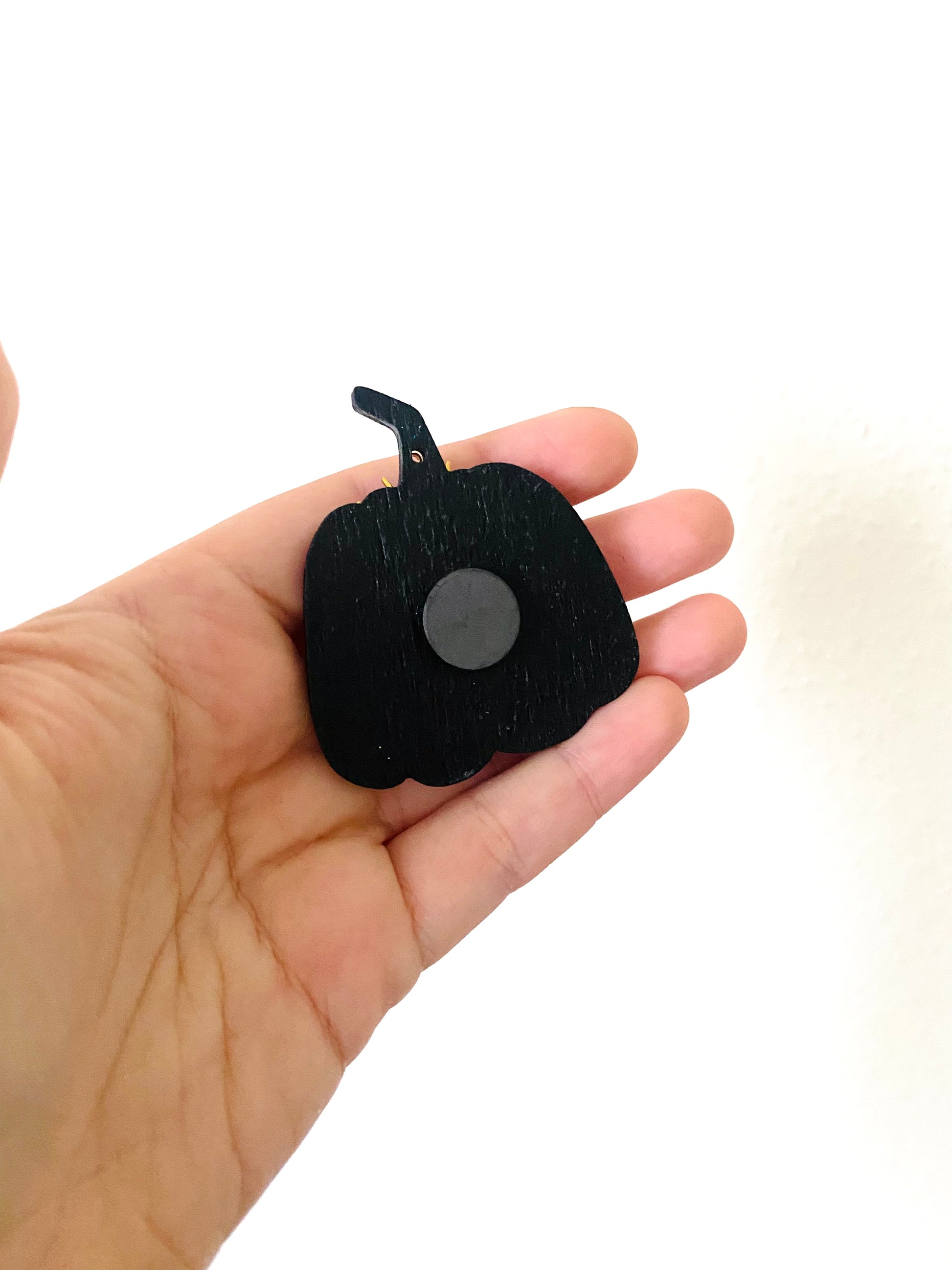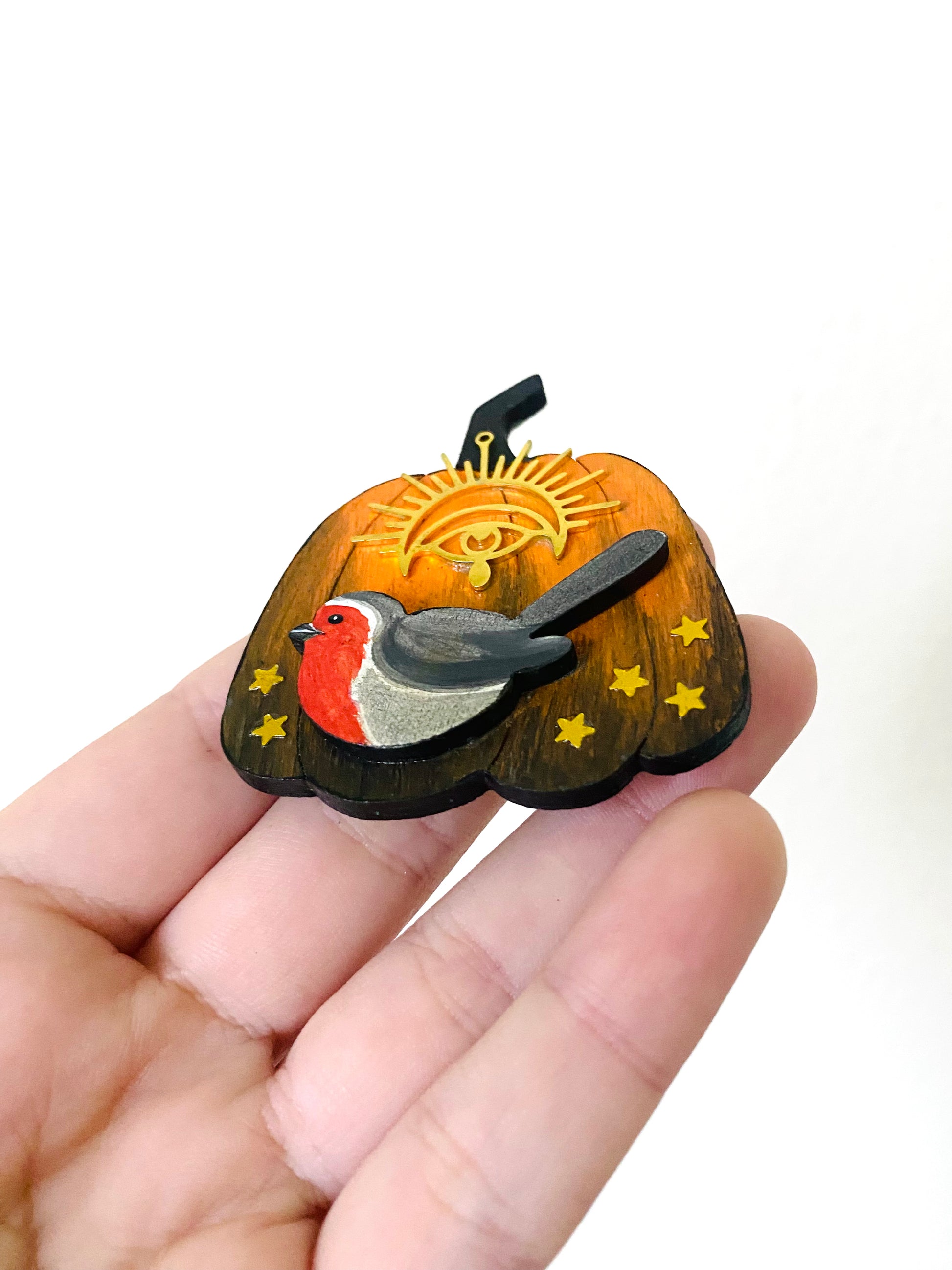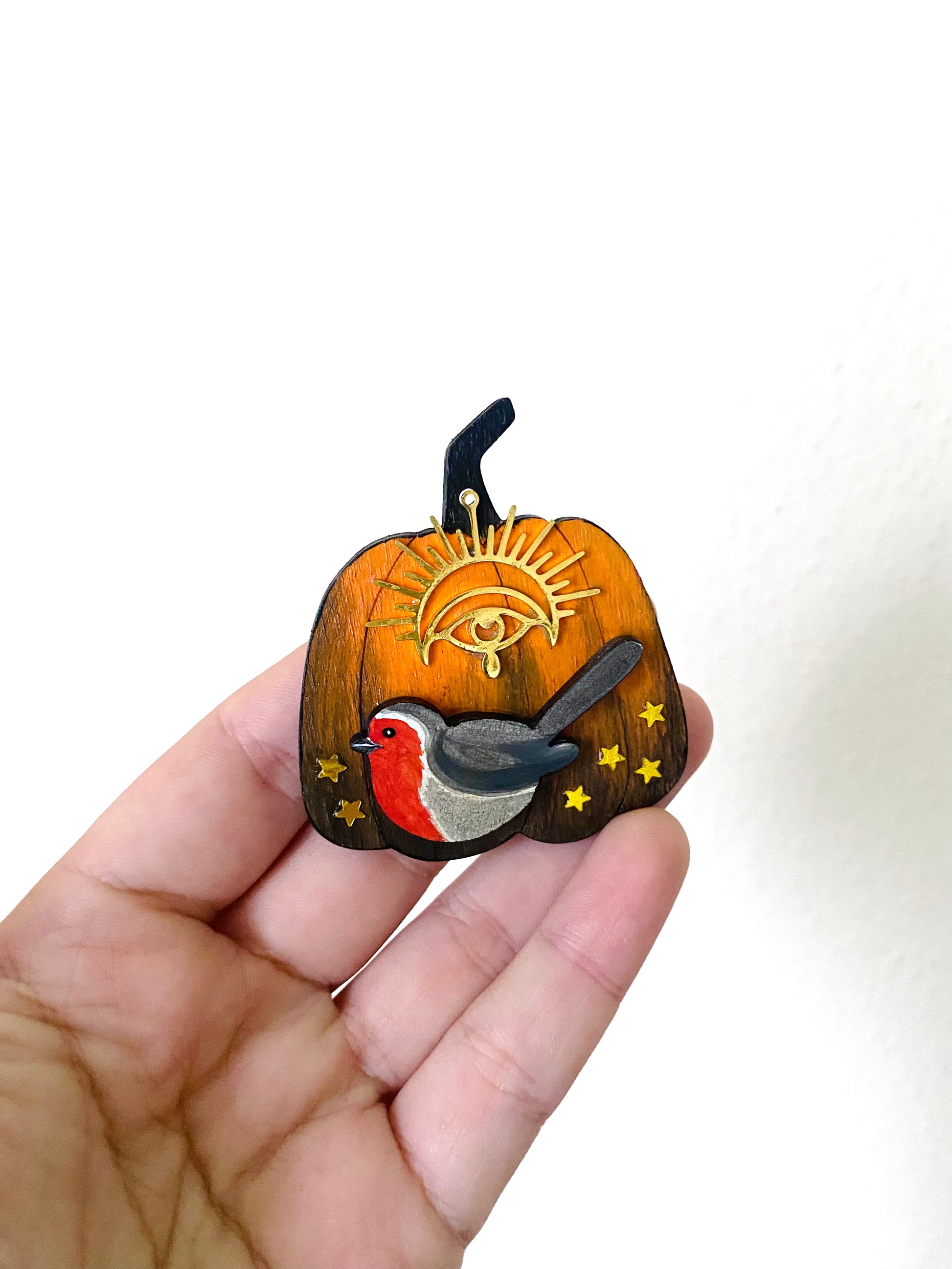 Hand-painted pumpkin magnet with robin, embellished with steel accents / Kézzel festett tök mágnes vörösbeggyel, fém alkatrészekkel