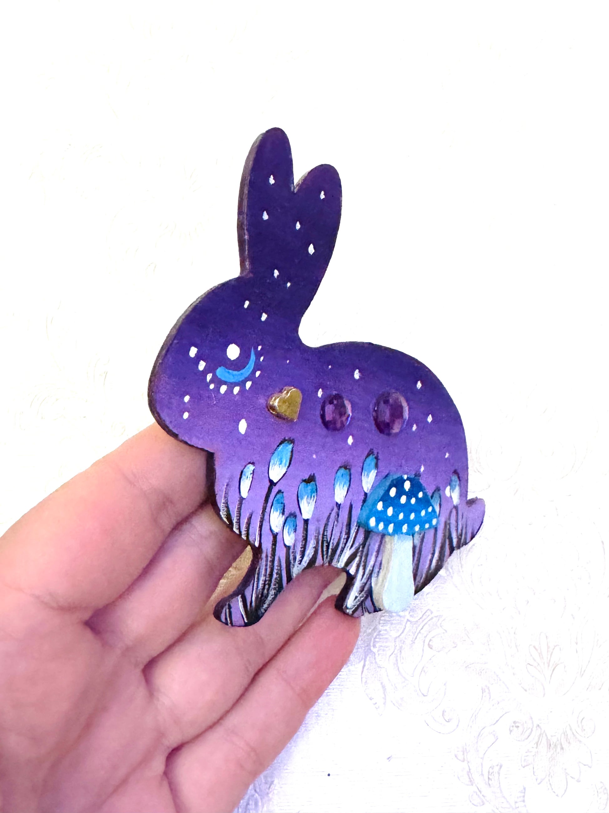 A hand-painted rabbit magnet. Its width is approx. 10 cm. Painted with acrylic paint, sealed with glossy varnish. Not only for Easter! ;)