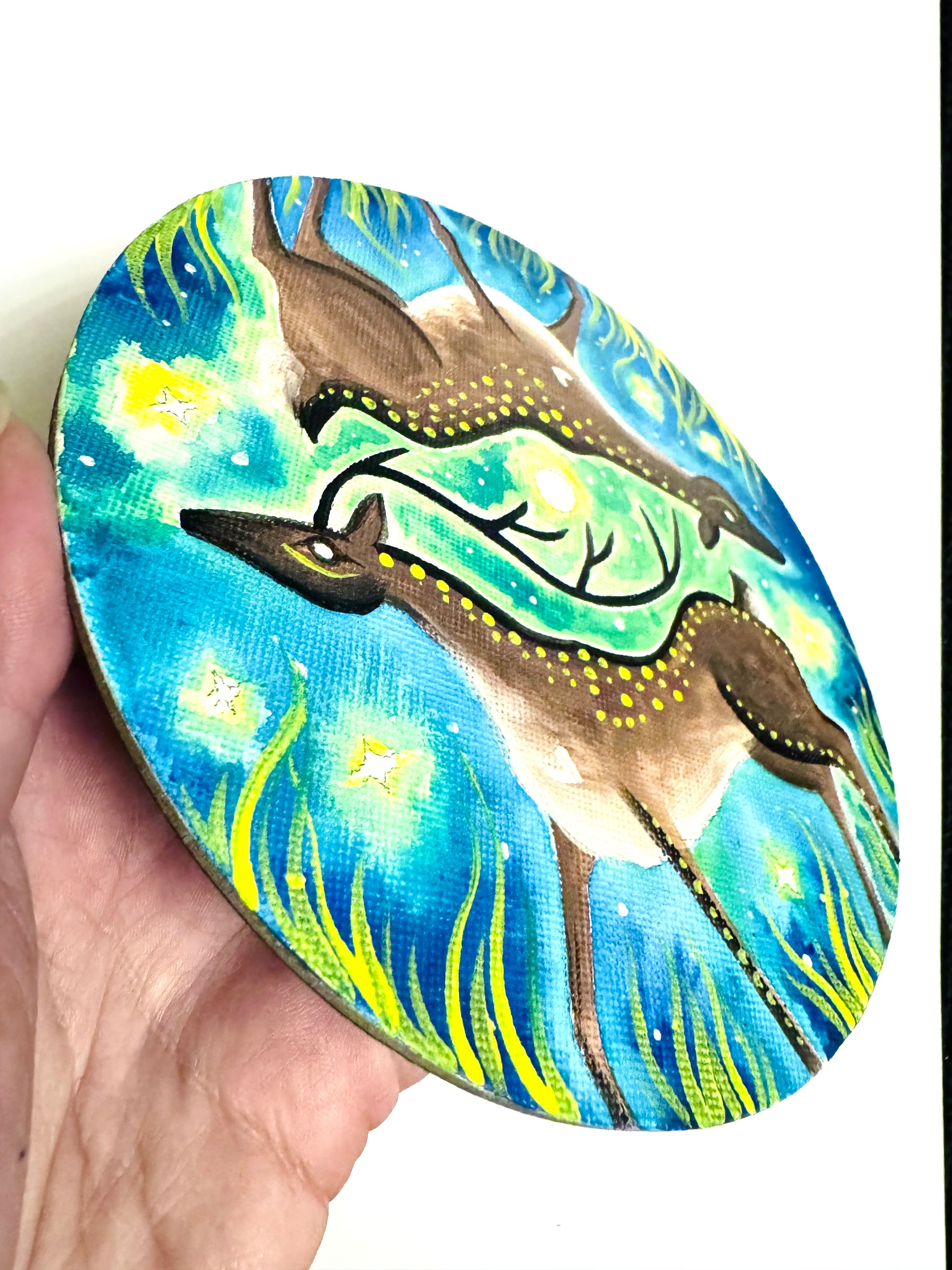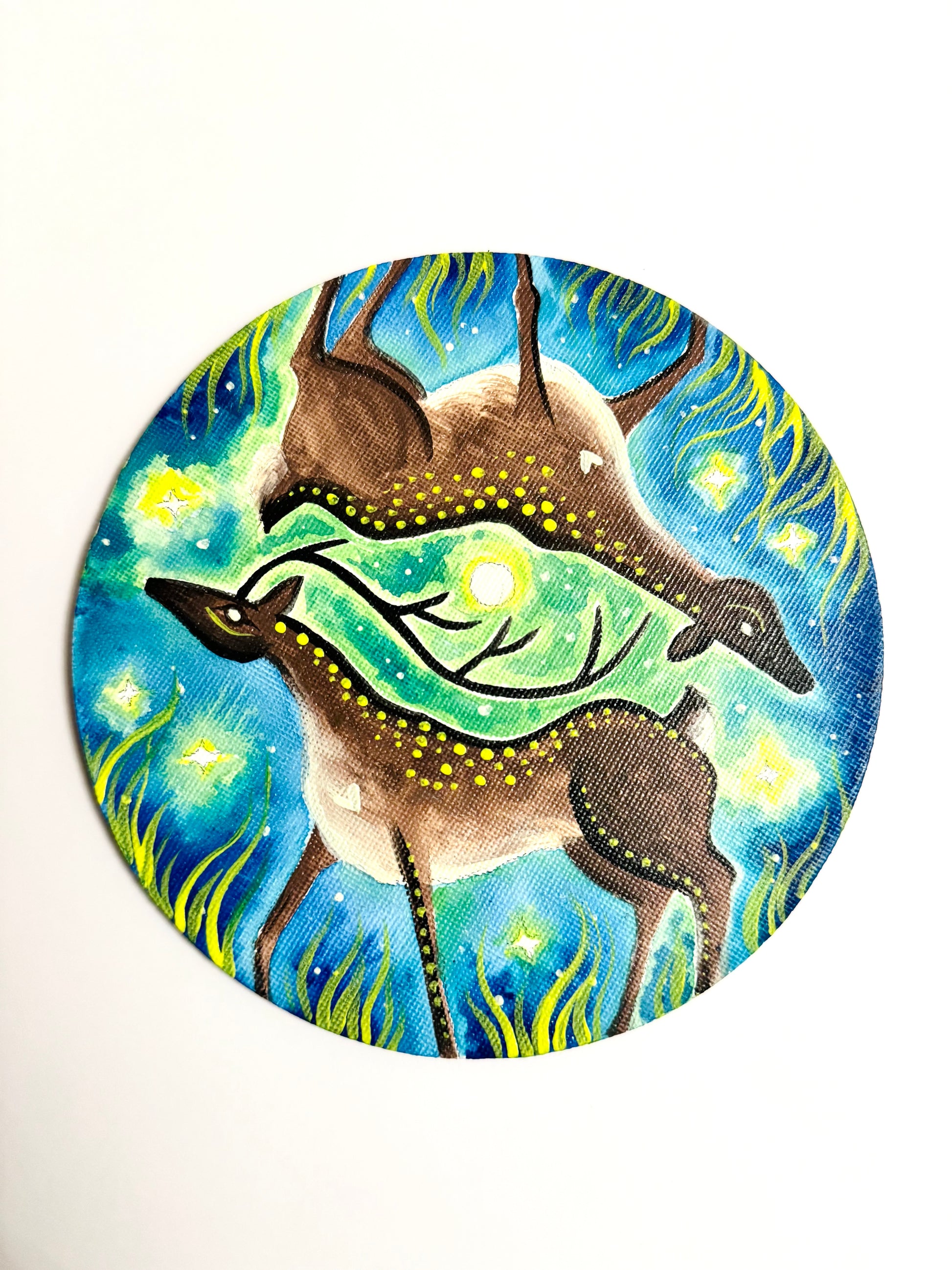 Painted on a 15 cm round stretched canvas, it will be a fun addition to your interior, especially if you like a bit of magic, and are into whimsical art on the darker side. The back of the canvas has a layer of magnetic sheet, so it works as a magnet, too!