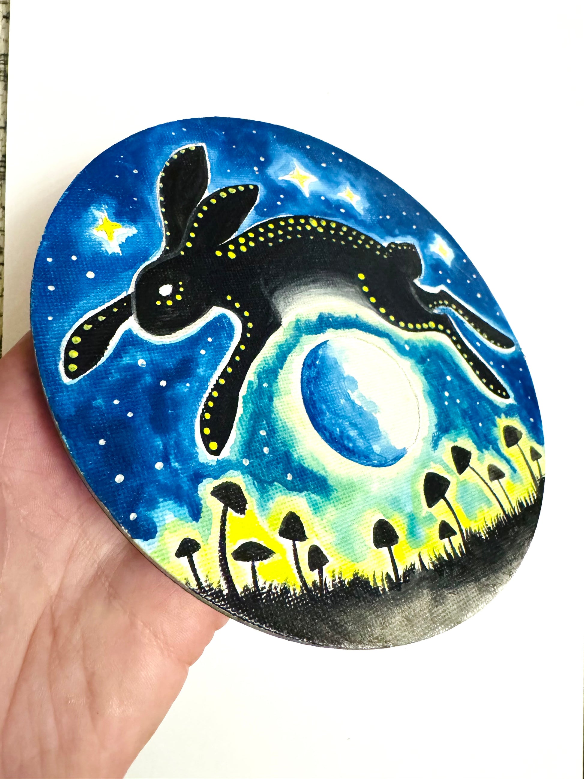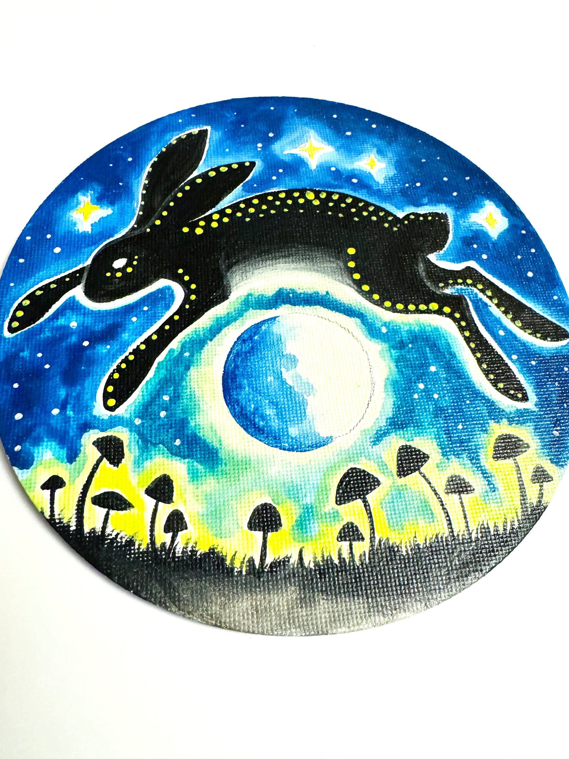 Painted on a 15 cm round stretched canvas, it will be a fun addition to your interior, especially if you like a bit of magic, and are into whimsical art on the darker side. The back of the canvas has a layer of magnetic sheet, so it works as a magnet, too!