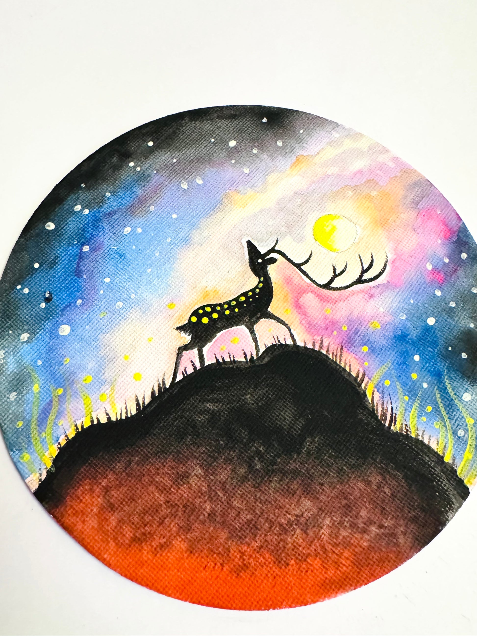 Painted on a 15 cm round stretched canvas, it will be a fun addition to your interior, especially if you like a bit of magic, and are into whimsical art on the darker side. The back of the canvas has a layer of magnetic sheet, so it works as a magnet, too!